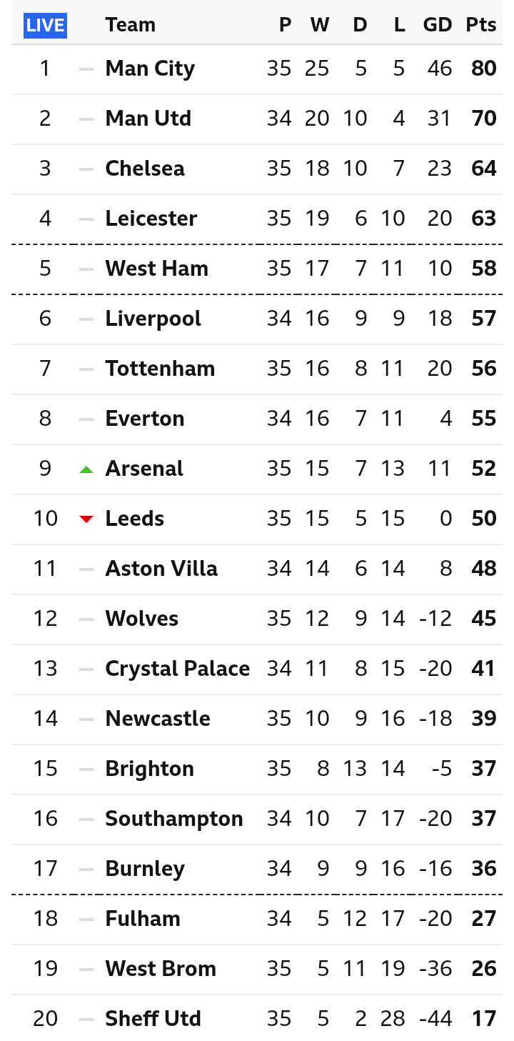 Manchester city secured a fifth premier league title and seventh english league title overall with three matches to spare; epl table. Select a team all teams arsenal aston villa brighton burnley chelsea crystal palace everton fulham leeds united leicester city liverpool manchester city manchester united newcastle united sheffield united southampton tottenham hotspur west.